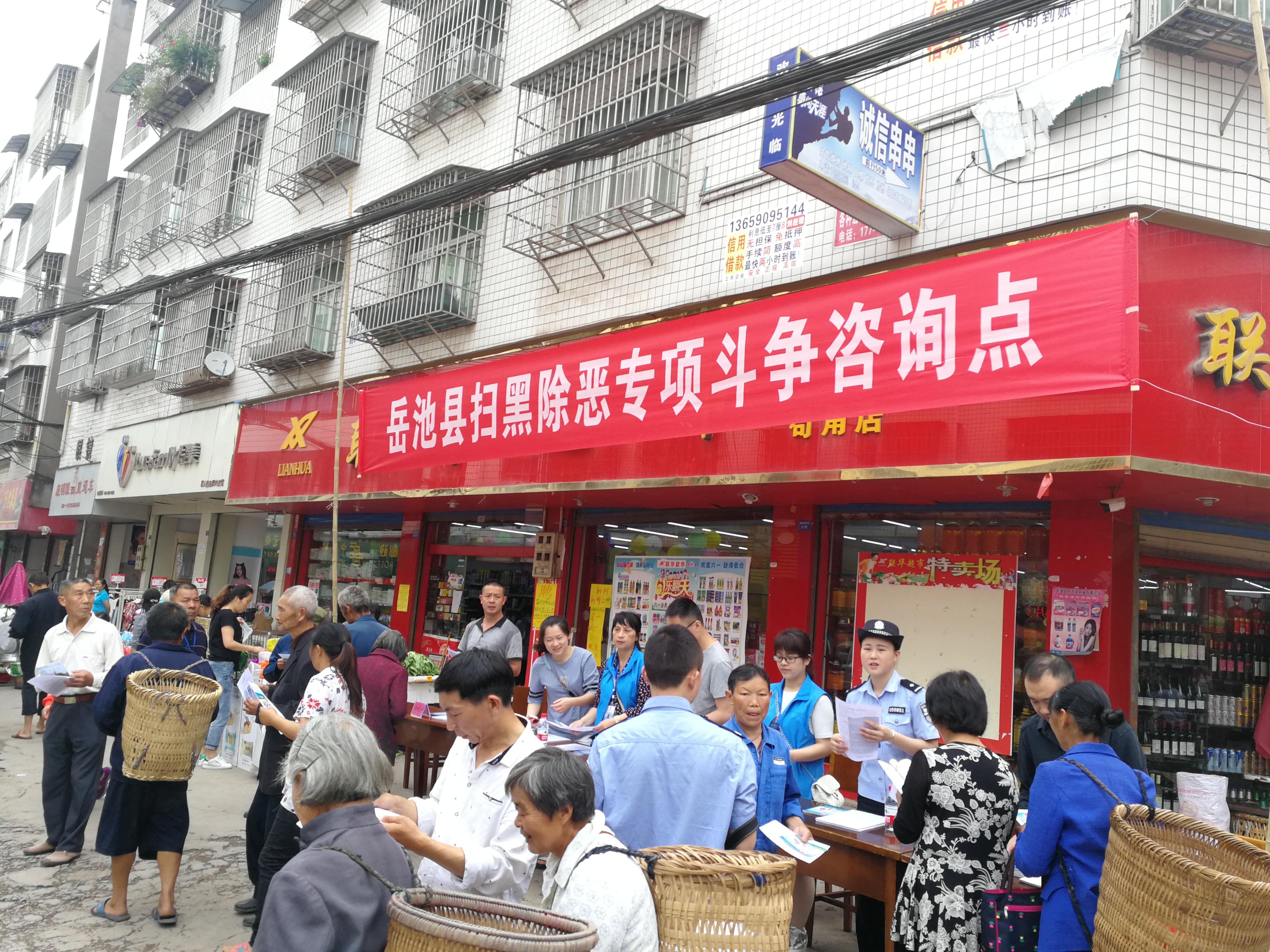 5月以来,岳池县公安局、检察院、法院、司法局干警以及律师组成扫黑除恶专项法治宣传队,在全县乡镇巡回开展了一系列声势浩大的扫黑除恶专项斗争主题法治宣传活动。